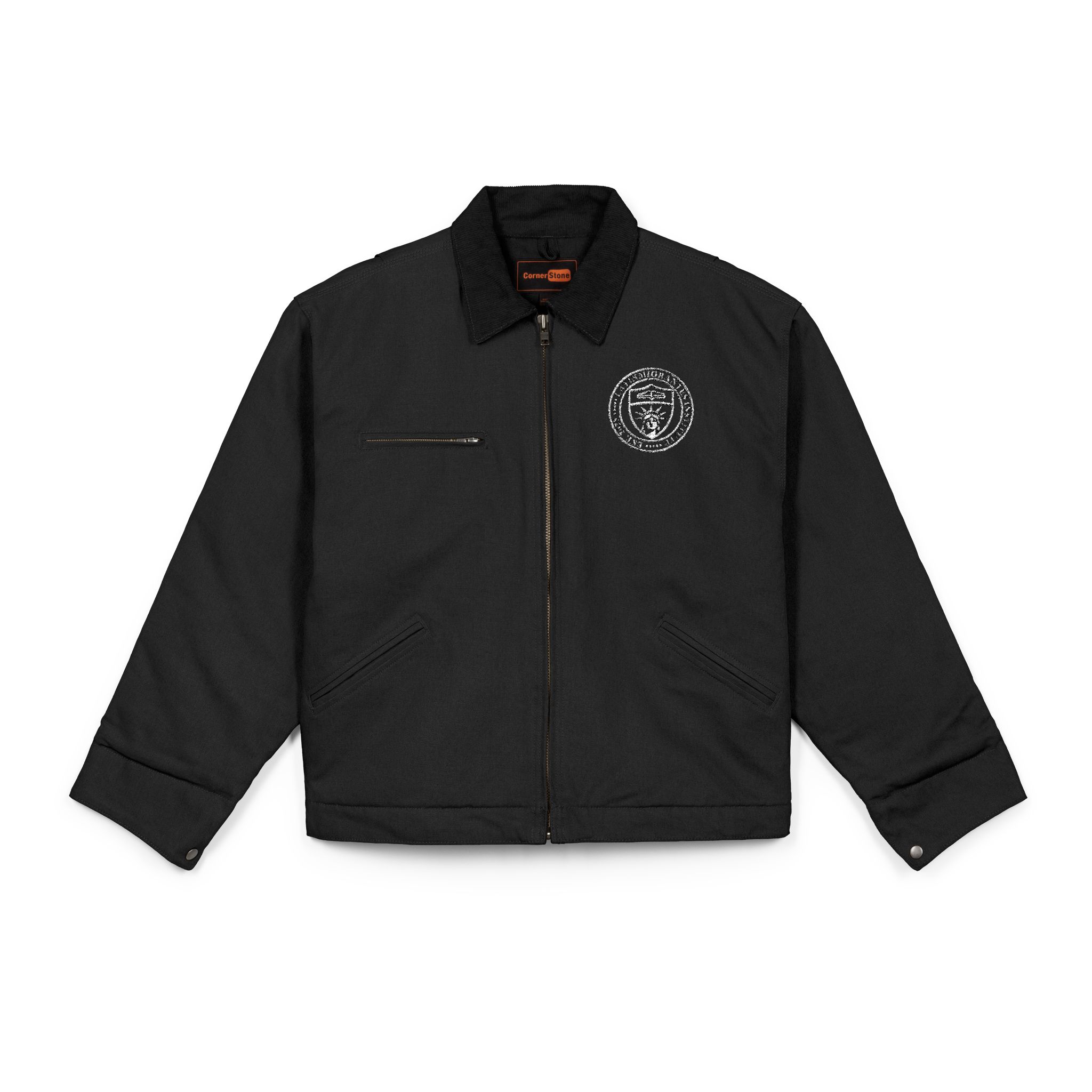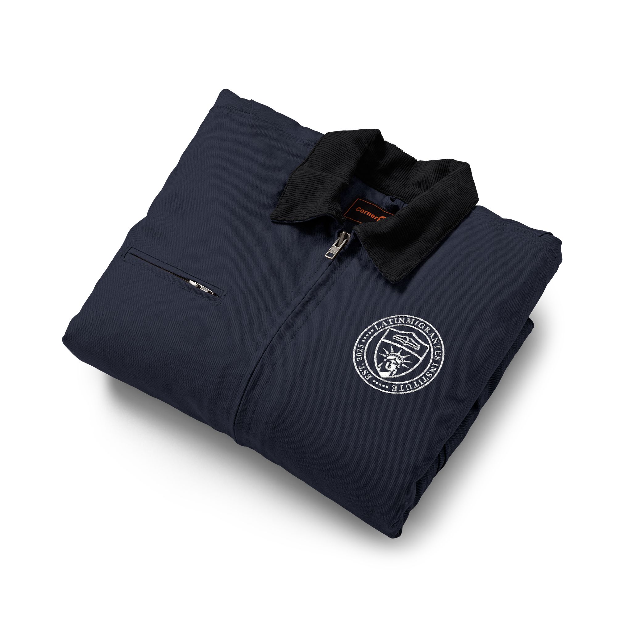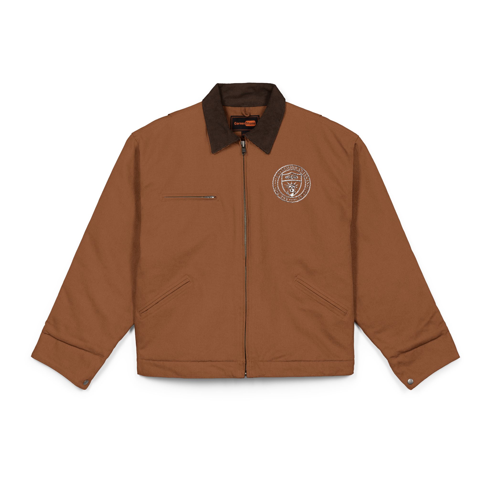 Una chaqueta clásica de inspiración heritage americana, diseñada para acompañarte durante años. Confeccionada en resistente duck canvas de algodón pesado, combina durabilidad con una estética limpia y atemporal. El cuello de pana (corduroy) añade un contraste elegante y una sensación cómoda al llevarla, mientras que el escudo bordado en el pecho aporta un detalle académico sutil que distingue la prenda sin necesidad de exageraciones.