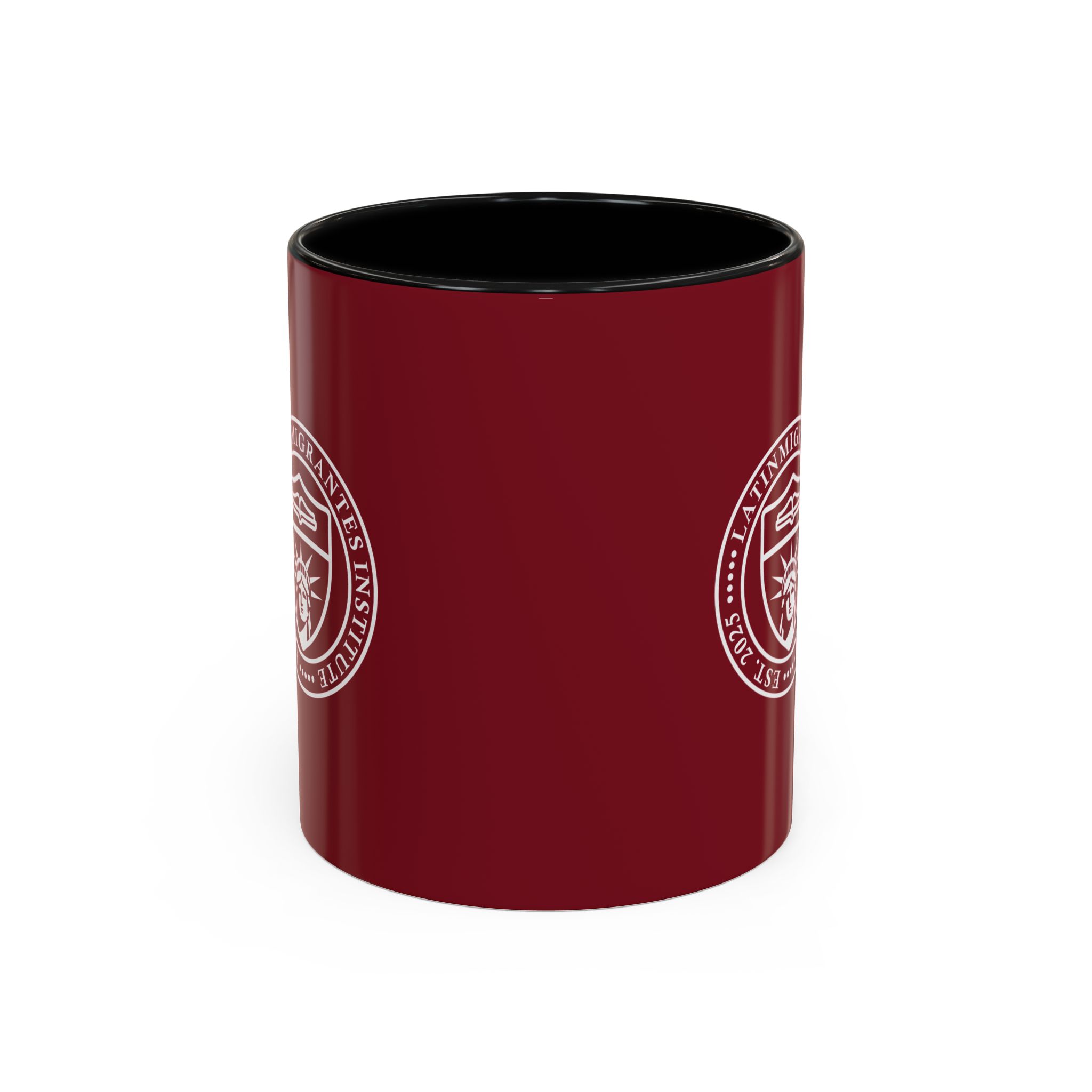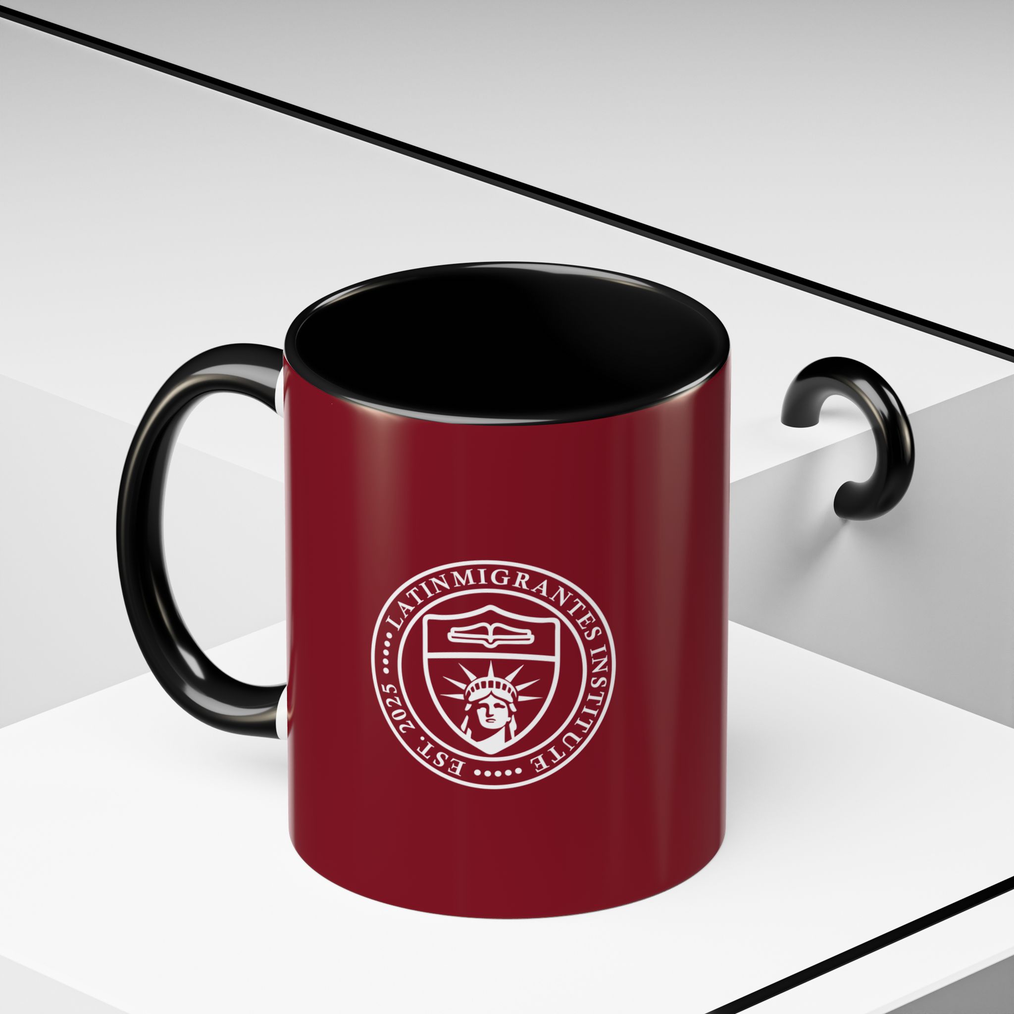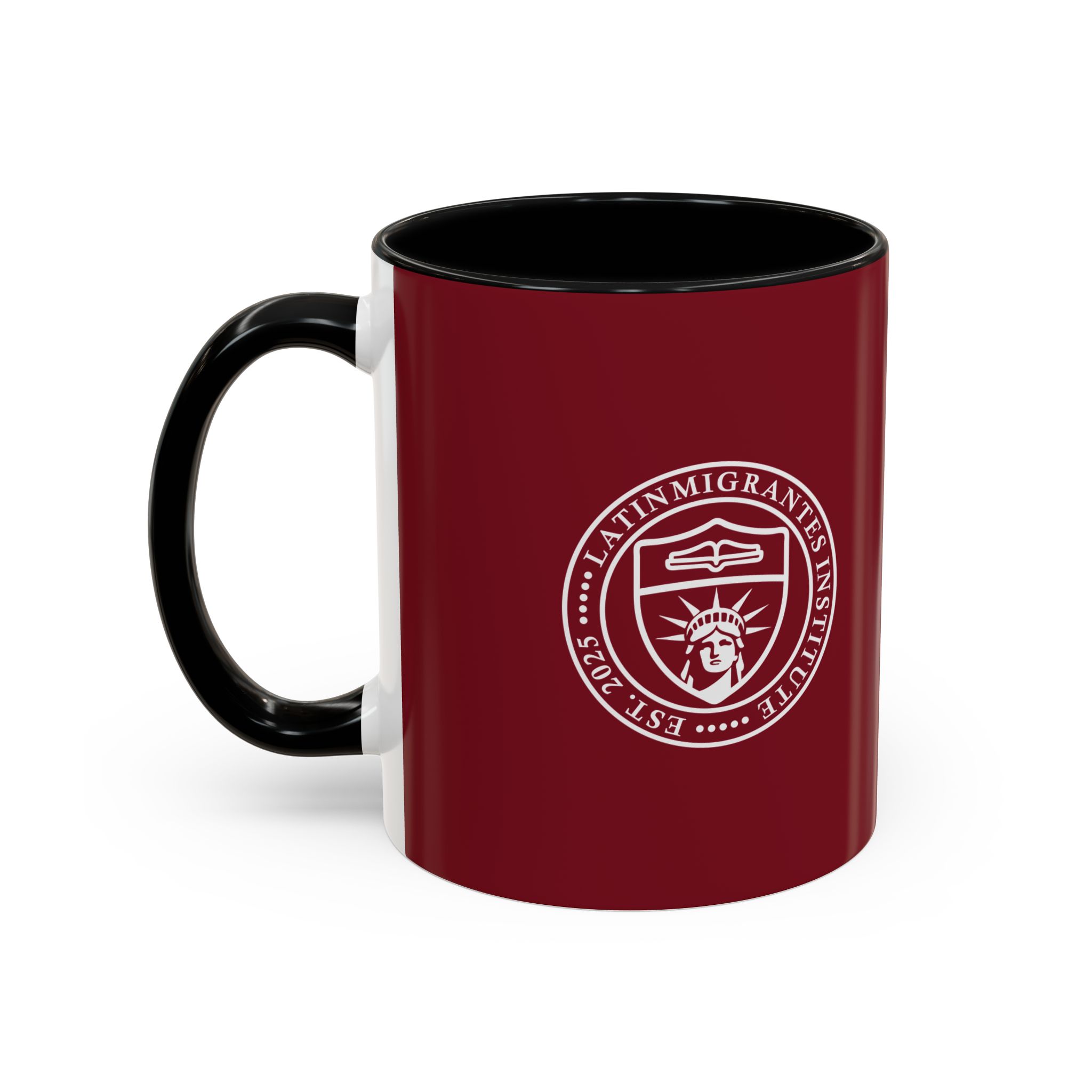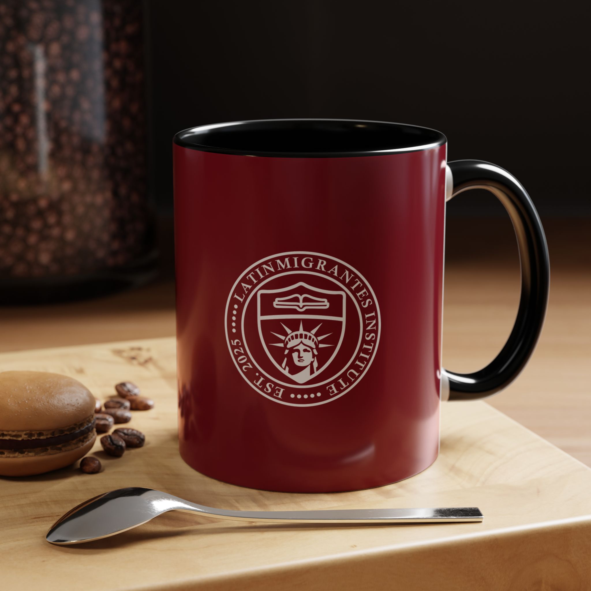 Esta taza de cerámica con acento en rojo profundo aporta un toque de identidad académica a los momentos cotidianos. El exterior en tono borgoña se combina con un interior y asa negros brillantes, creando un contraste elegante que resalta el sello del LatinMigrantes Institute en el centro. El emblema, limpio y equilibrado, evoca estudio, resiliencia y raíces culturales.